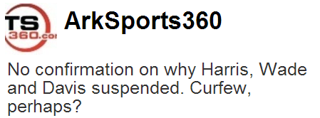 later confirmed that the players suspended are Matt Harris, Wendel Davis and Marques Wade by @ArkSports360