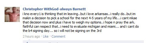 Chris Barnett has decided to take visits to Michigan and Miami. He want’s to make sure his decision is the right one. Let’s hope he decides to stick with the Hogs.