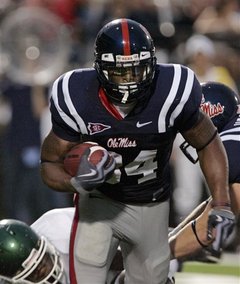 In this Sept. 19, 2009 photo Mississippi tailback Brandon Bolden sprints past a Southeastern Louisiana defender on his way to a 44-yard run in an NCAA football game in Oxford, Miss. The fourth-ranked Rebels will need as much as they can get out from Bolden as they head into Southeastern Conference play. Their first big challenge of the season comes Thursday night against South Carolina and the SEC’s No. 2 rushing defense. (AP Photo/Rogelio V. Solis)